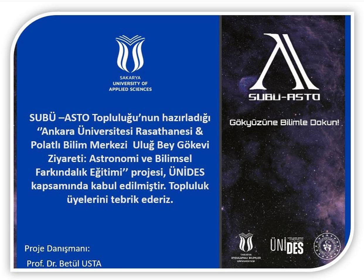 Sakarya Uygulamalı Bilimler Üniversitesi (SUBÜ) öğrenci topluluklarından Teknoloji Fakültesi bünyesindeki SUBÜ Astronomi (SUBÜ ASTO) Topluluğu'nun hazırladığı "Sakarya Gözlem Etkinlikleri (3. Dönem) ve “Ankara Üniversitesi Rasathanesi & Polatlı Bilim Merkezi Uluğ Bey Gökevi Ziyareti: Astronomi ve Bilimsel Farkındalık Programı (4. Dönem)" projeleri, Gençlik ve Spor Bakanlığı’nın Üniversite Öğrenci Toplulukları İş Birliği ve Destek Programı (ÜNİDES) kapsamında kabul edilmiştir.
